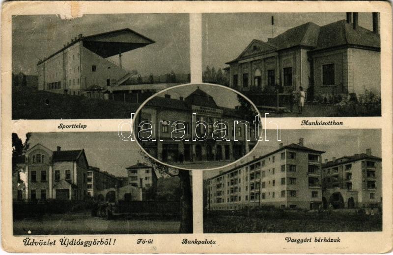 Újdiósgyőr, Diósgyőr (Miskolc); Sporttelep, Munkásotthon, Bankpalota, Takarékpénztár, üzletek, Fő út, Vasgyári bérházak (felületi sérülés / surface damage)