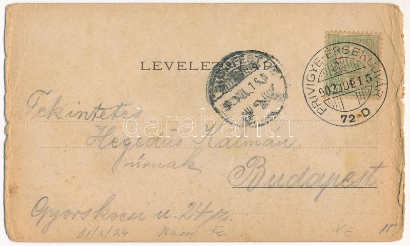 1902 Kisbélic, Malé Bielice (Simony, Partizánske); fürdő / spa, bath + "PRIVIGYE - ÉRSEKUJVÁR 72 D" vasúti mozgóposta bélyegző (b)