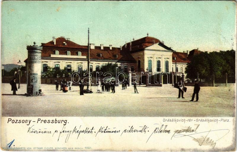 1902 Pozsony, Pressburg, Bratislava; Grásálkovich tér és palota, hirde... https://www.darabanth.com/en/415-Online-auction/415.0/Postcards/Slovakia~1000007/1902-Pozsony-Pressburg-Bratislava-Grasalkovich-ter-es-palota-hirdetooszlop-heliocolorkarte~II2602393
