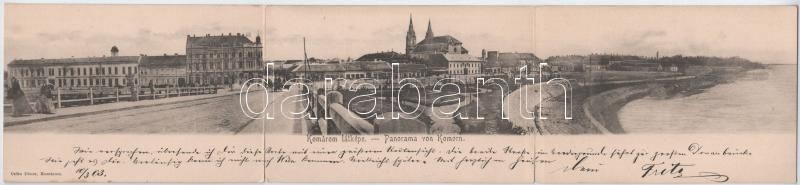 1903 Komárom, Komárno; látkép, híd, hajómalom a Duna-parton. Czike Dénes kiadása. 3-részes kihajtható panorámalap / general view, bridge, Danube riverside, floating ship mill (boat mill). 3-tiled folding panoramacard (hajtásnál szakadt / torn at fold)