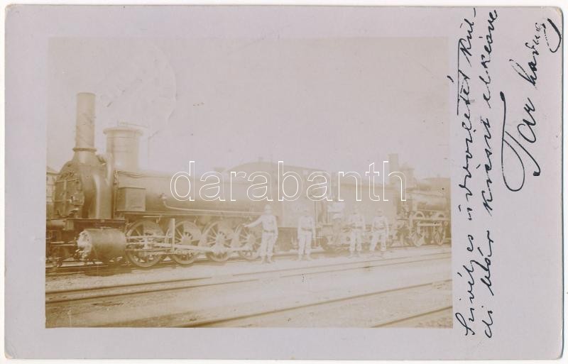 1904 Pozsony, Pressburg, Bratislava; vasútállomás, MÁV gőzmozdonyok katonákkal. Hátoldalon Kallós Bertalan iparfelügyelőnek ( későbbi államtitkár) címezve / railway station, locomotives with K.u.k. soldiers. photo