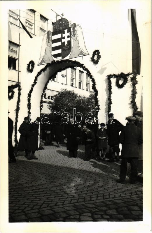 1938 Kassa, Kosice; bevonulás, díszkapu magyar címerrel / entry of the Hungarian troops, decorated gate with Hungarian coat of arms. photo