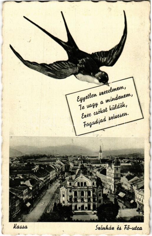 Description: 1943 Kassa, Kosice; "Egyetlen szerelmem, te vagy a mindenem, ezer csókot küldök, fogadjad szívesen". Montázslap fecskével / Love greeting montage postcard with swallow