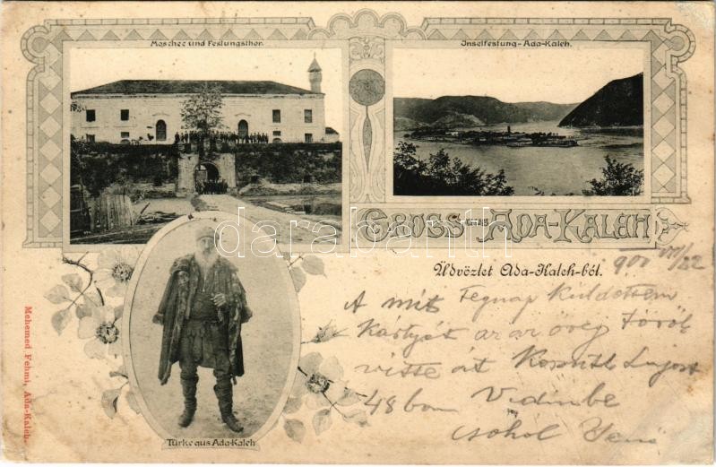 Description: 1901 Ada Kaleh, Moschee und Festungstor, Inselfestung, Türke aus Ada Kaleh / Mecset és várkapu, Török férfi. Mehmed Fehmi kiadása / mosque, castle gate, Turkish man. Art Nouveau, floral (r)