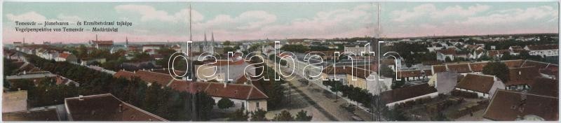Temesvár, Timisoara; Józsefvárosi és Erzsébetvárosi látkép madártávlatból. Kihajtható 3-részes panorámalap / Vogelperspektive von Temesvár / 3-tiled folding panoramacard. Fotograf J. Szenetra (r)