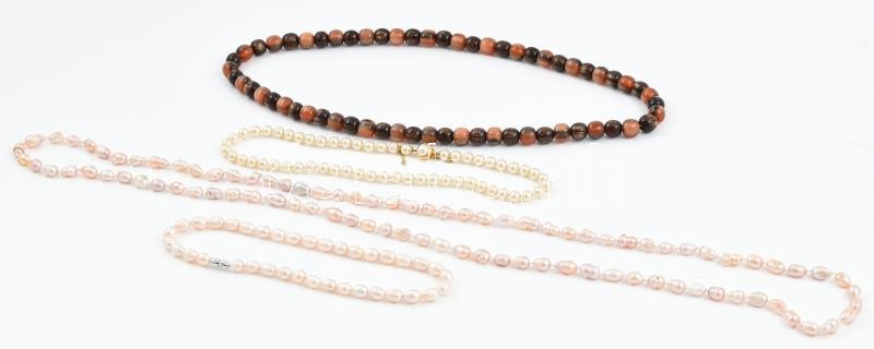 4 db nyaklánc, tenyésztett gyöngy, macskaszem és tekla, klf, hosszúságú.