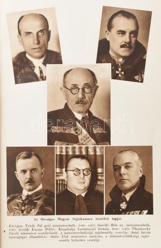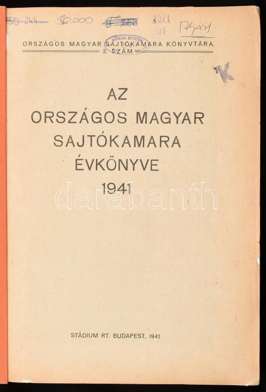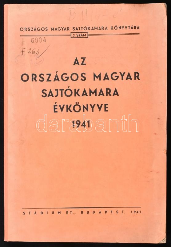 1941 Az Országos Sajtókamara évkönyve 1941. Országos Magyar Sajtókamara Könyvtára 3. sz. Gazdag kép és reklámanyaggal. Tagnévsorok (több száz névvel, címmel); a 171-270. oldalakon a Magyarországon megjelenő időszaki lapok A bevezető cikket - ,,Erdély éve" - Kolosváry-Borcsa Mihály írta. Bp.,1941., Stádium-ny., 448+1 p+ 30 (képtáblák, közte 1 színes: Horthy Miklós színes egészalakos képével) t. Félvászon gerinccel pótolt, javított papírkötés, intézményi bélyegzőkkel. Az Országos Magyar Sajtókamara, mely létrehozását az 1938-as törvény írta elő, és a "nemzetellenes" és "zsidó befolyás" kiszorításra jött létre. A zsidótörvények rendelkezéseit, a később háborús bűnösként elítélt Kolosváry-Borcsa Mihály (1896-1946) foganatosította.