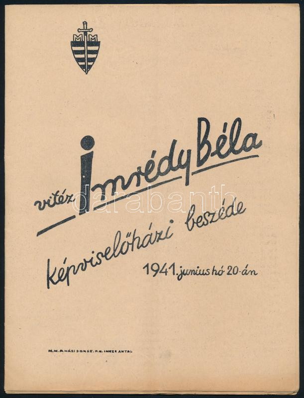 https://www.darabanth.com/en/416-Online-auction/416.0/Art-and-other-collectibles/Printed-Materials~1000002/1941-vitez-Imredy-Bela-kepviselohazi-beszede-1941-junius-ho-20-an-24-p-~II2621210