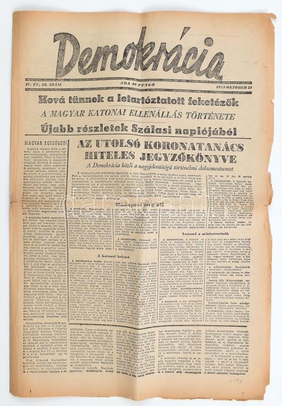 https://www.darabanth.com/en/416-Online-auction/416.0/Art-and-other-collectibles/Printed-Materials~1000002/1945-A-Demokracia-cimu-ujsag-IV-evfolyamanak-28-szama-cimlapon-Az-utolso-koronatanacs~II2619809