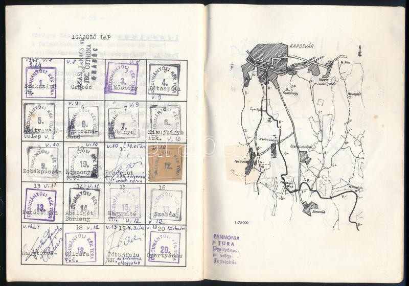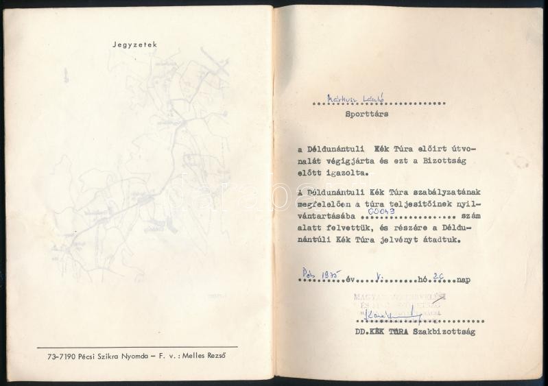1973 Dél-dunántúli Kék Túra igazoló füzete. Pécsi Szikra-ny., 55+(8) p... https://www.darabanth.com/en/416-Online-auction/416.0/Art-and-other-collectibles/Printed-Materials~1000002/1973-Del-dunantuli-Kek-Tura-igazolo-fuzete-Pecsi-Szikra-ny-55plus8-p-Harom-fekete-feher~II2621664