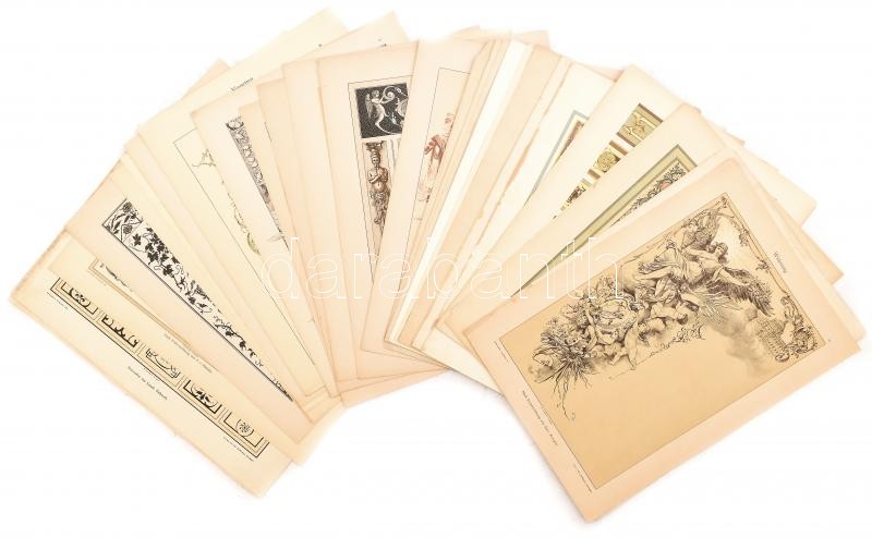 Description: cca 1900-1910 Dekorative Vorbilder, 30 db szecessziós, historizáló és egyéb ornamentikával, illusztrációval díszített nyomat. Lapok széle részben kisebb szakadásokkal vagy kisebb foltokkal. Lapméret: 36x25 cm