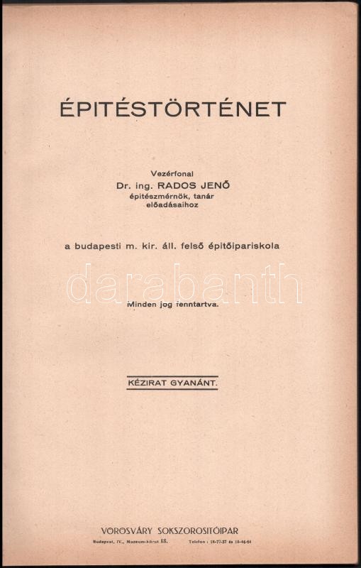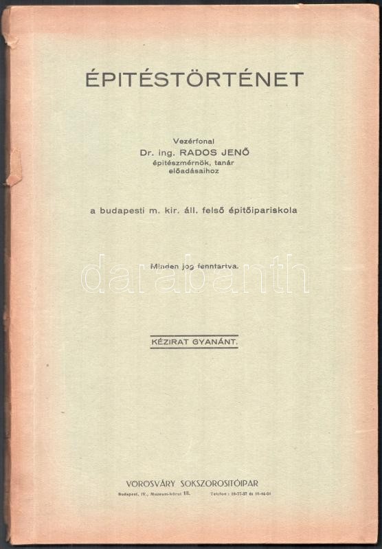 Építéstörténet. Vezérfonal Dr. Rados Jenő előadásaihoz. Budapesti M. K... https://www.darabanth.com/en/416-Online-auction/416.0/Books/Books-Architecture-Art~1000012/Epitestortenet-Vezerfonal-Dr-Rados-Jeno-eloadasaihoz-Budapesti-M-Kir-All-Felso-EpC3~II2615546