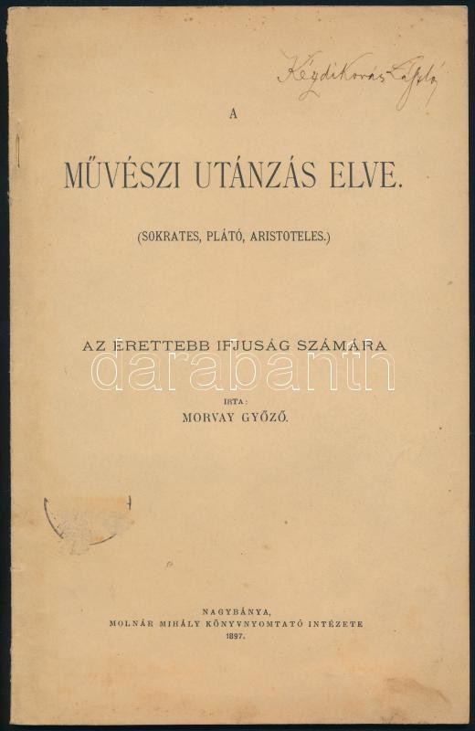 Morvay Győző: A művészi utánzás elve. (Sokrates, Plátó, Aristoteles). Nagybánya, 1897, Molnár Mihály. A borítón Kézdi-Kovács László (1864-1942) festőművész, újságíró, műkritikus, a Pesti Hírlap belső munkatársának névbejegyzésével. Kiadói papírkötés, kissé kopott és kissé foltos borítóval.