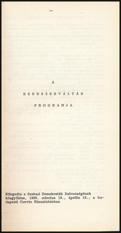 1989 SZDSZ A rendszerváltás programja. Bp., 1989,Szabad Demokraták Szövetsége,(Nyíregyháza, Nyírségi Nyomda.) Kiadói kissé kopott papírkötés.