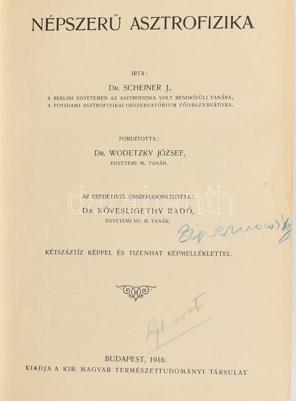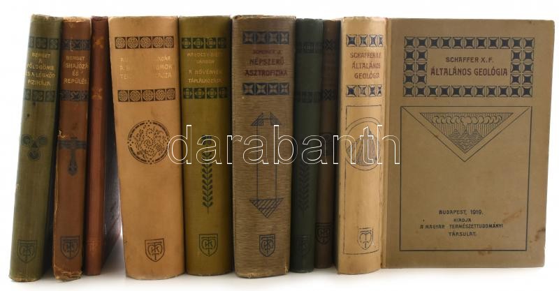 A Kir. M. Természettudományi Társulat kiadványainak 9 kötete: Berget Alfonz: A földgömb és a légkör fizikája.; Berget Alfonz: Léghajózás és repülés.; Sody Frederick: A rádium.; Aujeszky Aladár: A baktériumok természetrajza.; Schaffer X. Ferenc: Általános geológia.; Molisch Hans: Növényélettan, mint a kertészet elmélete.; Göldi A. Emil-Gorka Sándor: A rovarok szerepe a betegségek előidézésében és terjesztésében.; Mágocsy-Dietz Sándor: A növények táplálkozása.; Scheiner J.: Népszerű asztrofizika.; Bp., 1909-1925., Kir. M. Természettudományi Társulat. Kiadói szecessziós aranyozott, festett egészvászon-kötések és félvászon-kötések, egy kivételével Gottermayer-kötések, változó állapotban, közte kopott, foltos borítókkal, egy kötet gerince sérült, de belül nagyrészt jó állapotban.