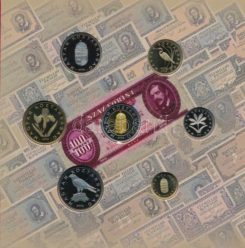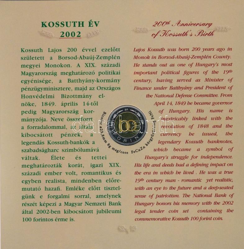 https://www.darabanth.com/en/416-Online-auction/416.0/Numismatics/Hungarian-coins-and-coins-with-Hungarian-mint-marks~1500008/2002-1-100Ft-7xklf-plus-100Ft-Kossuth-forgalmi-sor-szettben-belso-tok-ragasztasa-kisse-elenged~II2622780