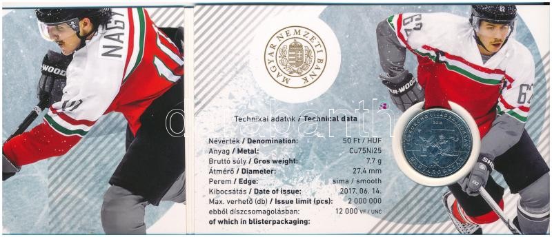 2018. 50Ft "Jégkorong Világbajnokság" az érme az elsőnapi verethez hasonló bliszterben: "ELSŐNAPI VERET" felirat és sorszám nélkül, a belső oldalon az MNB kisebb méretű pecsétjével, az érme műanyag tok helyett a névértékes oldalával a díszlapra ragasztva, feltehetően külföldi értékesítésre szánva mivel a technikai adatok angol nyelvű megnevezése félkövérrel szedve, valamint hibás "2017. 06. 14." dátummal T:1