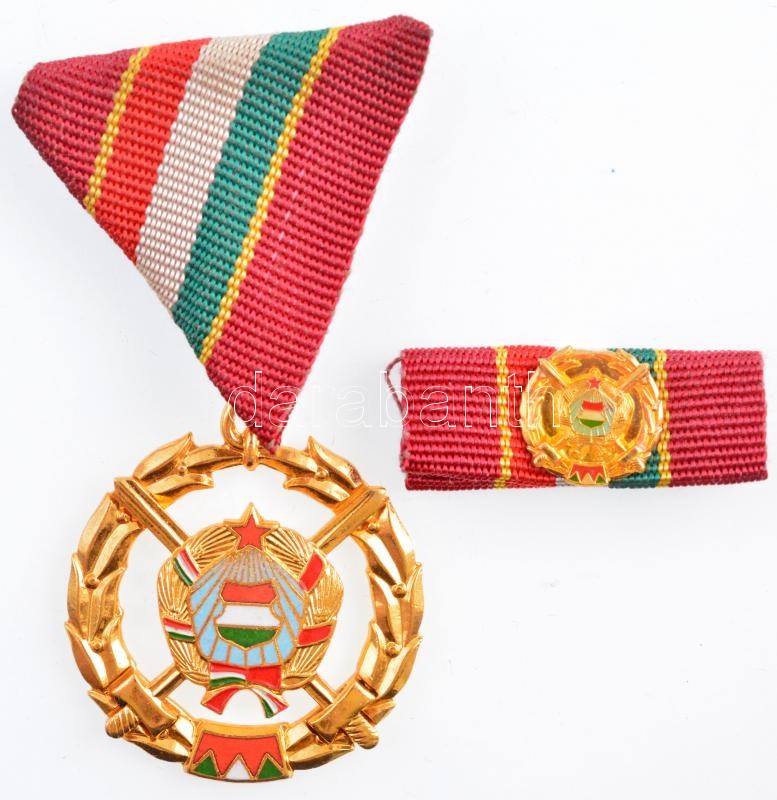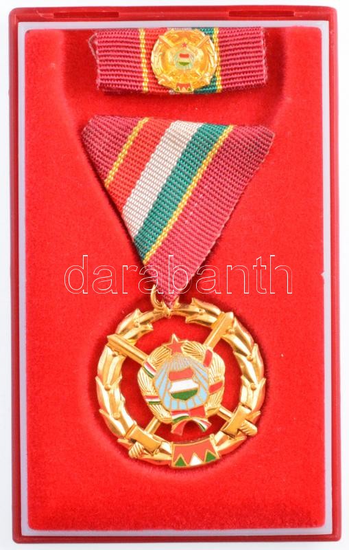 1979. "Fegyverbarátságért Érdemérem arany fokozata" zománcozott, aranyozott Br kitüntetés mellszalagon, szalagsávval, miniatűrrel, eredeti, sérült tokban T:1- Hungary 1979. "Medal for Weapon Friendship, Golden Grade" enamelled, gold plated Br decoration with ribbon, miniature and miniature ribbon, in damaged case C:AU NMK 717.