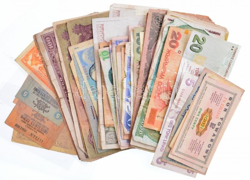 61db vegyes magyar és külföldi bankjegy, közte 1996. 1000Ft "E 88765744", olasz, ukrán, orosz bankjegyek T:III,III- 61pcs of mixed banknotes from diff countries, 1996. 1000 Forint "E 88765744", Hungarian, Italian, Ukrainian, Russian banknotes C:F,VG