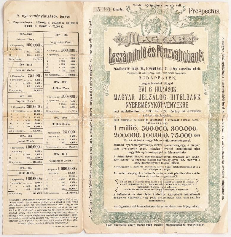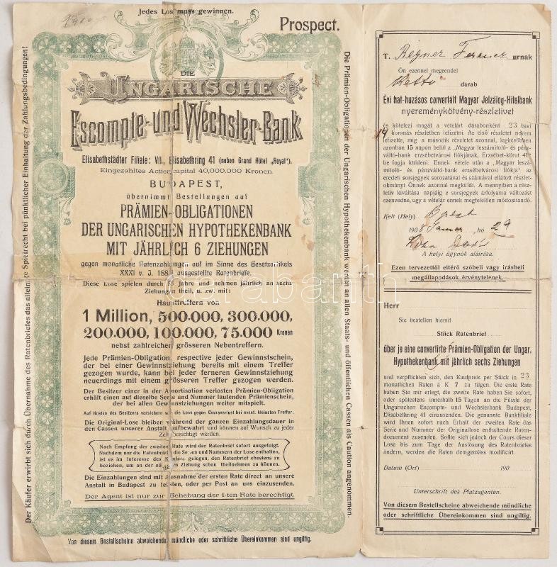 Description: Budapest 1908. "A Magyar Leszámitoló és Pénzváltóbank megrendeléseket elfogad évi 6 húzásos Magyar Jelzálog-Hitelbank nyereménykötvényekre" magyar és német nyelvű prospektus T:III- ragasztott