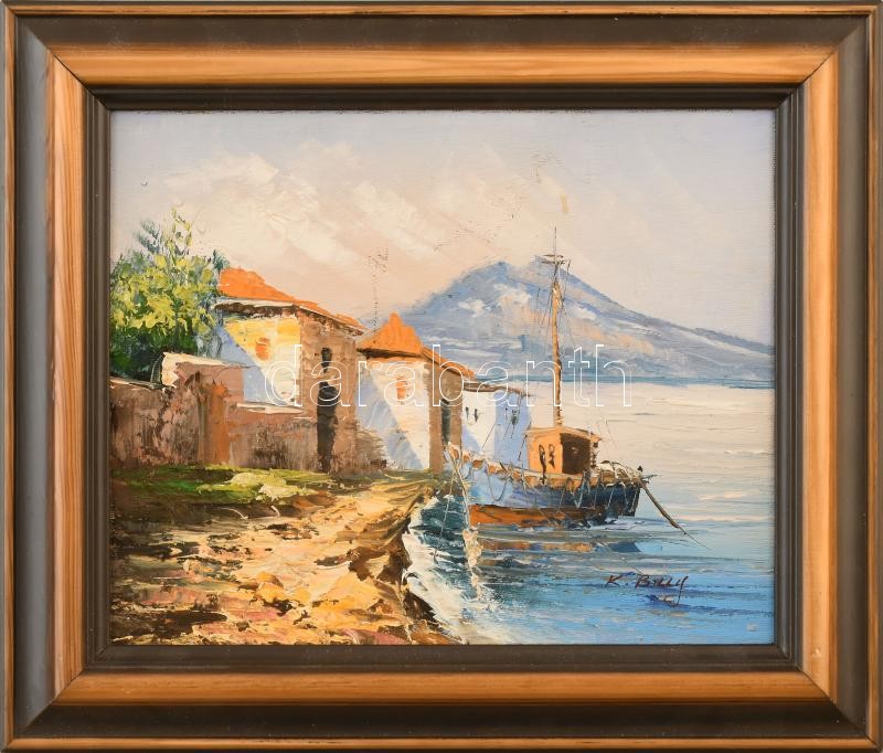 K Billy jelzéssel: Hajó a tengerparton. Olaj, karton. Dekoratív fakeretben. 21x25 cm