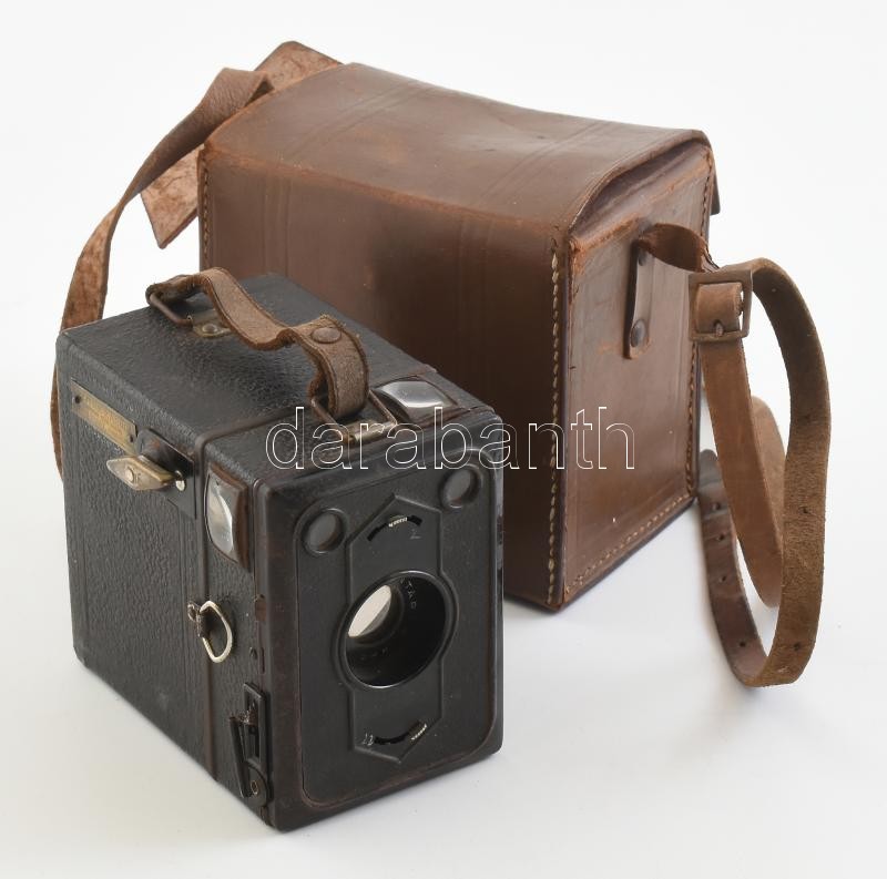 cca 1950 Zeiss Ikon Box Tengor 6x9 cm rollfilmes kamera, Goerz Frontar objektívvel, eredeti bőr tokjával, kissé sérült, kopott, 8x6x5 cm