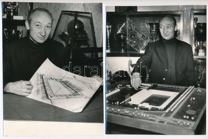 Description: 1969 A Ferencváros új Üllői úti labdarúgó stadionjának tervezete és makettje, Harót János az FTC elnöke bemutatásával, 2 db fotó, jó állapotban, 17×13 cm