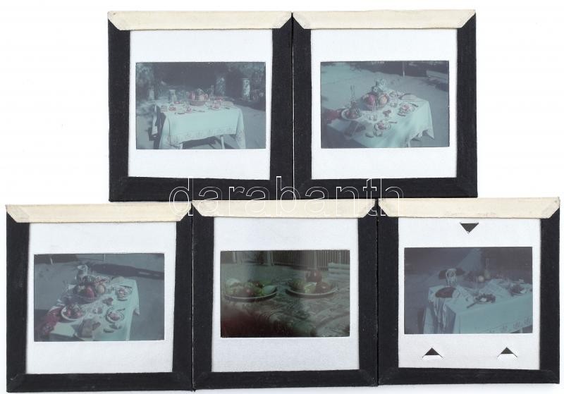 cca 1940 Asztali csendéletek, 5 db Agfacolor színes diapozitív