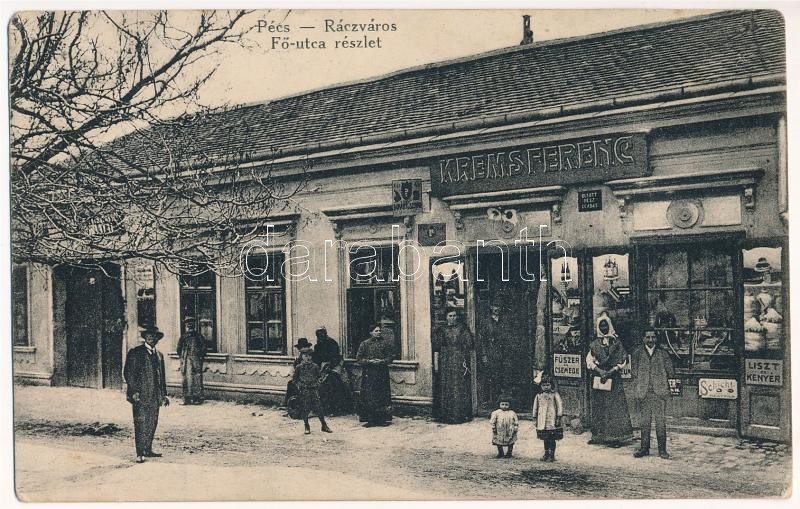 https://www.darabanth.com/en/416-Online-auction/416.0/Postcards/Hungary~2000012/1917-Pecs-Racvaros-Fo-utca-reszlet-Krems-Ferenc-uzlete-es-sajat-kiadasa-kopott-sarkak-~II2622142
