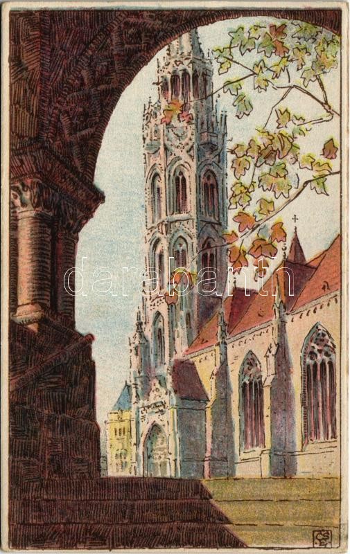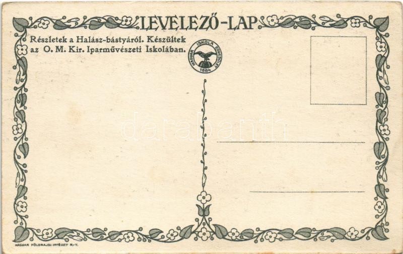 Budapest I. Részletek a Halászbástyáról. Készültek az O. M. Kir. Iparművészeti Iskolában. Magyar Földrajzi Intézet R.-T. kiadása s: Cs. E. (EK)