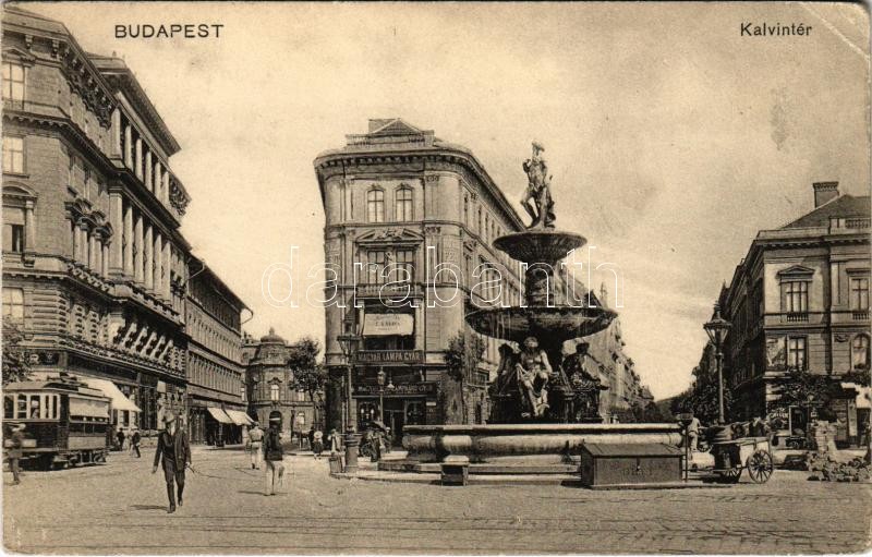 Budapest VIII. Kálvin tér, villamos, szökőkút, Magyar Lámpagyár, üzlet...