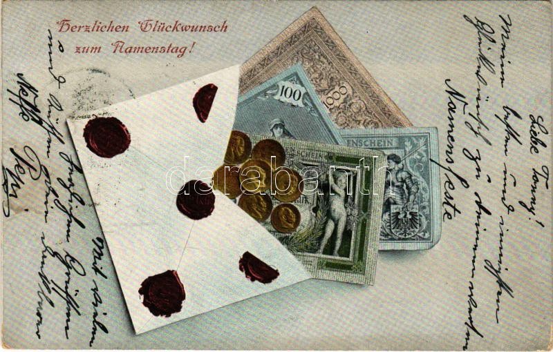 1906 Herzlichen Glückwunsch zum Namenstag! / Name Day greeting art postcard with German banknotes and coins