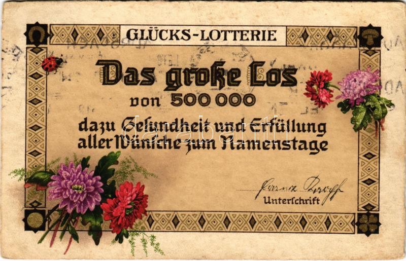 1937 Glücks-Lotterie. Das große Los von 500,000 dazu Gesundheit und Erfüllung aller Wünsche zum Namenstage / Lottery art postcard (EK)