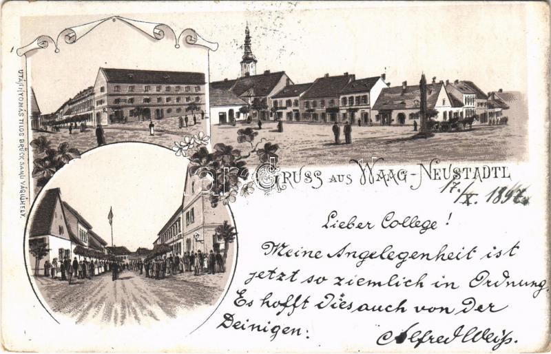 1897 (Vorläufer) Vágújhely, Waag-Neustadt, Nové Mesto nad Váhom; utca, tér / street, square. Brück Samu Art Nouveau, floral, litho