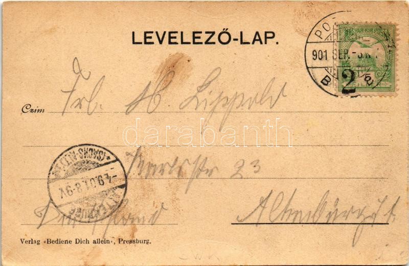 1901 Pozsony, Pressburg, Bratislava; Totale, Bahnhof, Stadt-Theater, Das Schloss / Városi színház, vasútállomás, villamos, Királyi vár. Verlag "Bediene dich allein" Szecessziós lóherés montázs / theatre, railway station, tram, castle. Art Nouveau, litho clover montage (EK)