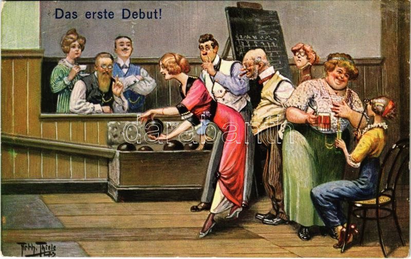 1927 Das erste Debut! / Women at the bowling alley, drinking and smoking. T.S.N. Serie 1682. (6 Dess.) s: Arth. Thiele (EB)