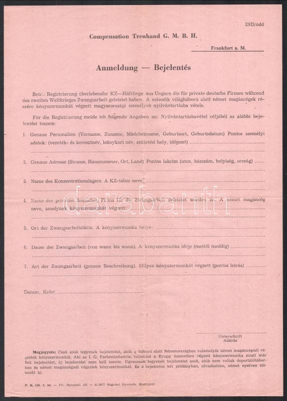 cca 1960-1970 Kényszermunka teljesítéséért járó német kártérítés bejelentő lapja