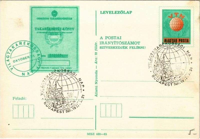 1977 Országos Takarékpénztár Takarékbetét-Könyv reklámja + "Világtakarékossági Nap" So. Stpl (EK)
