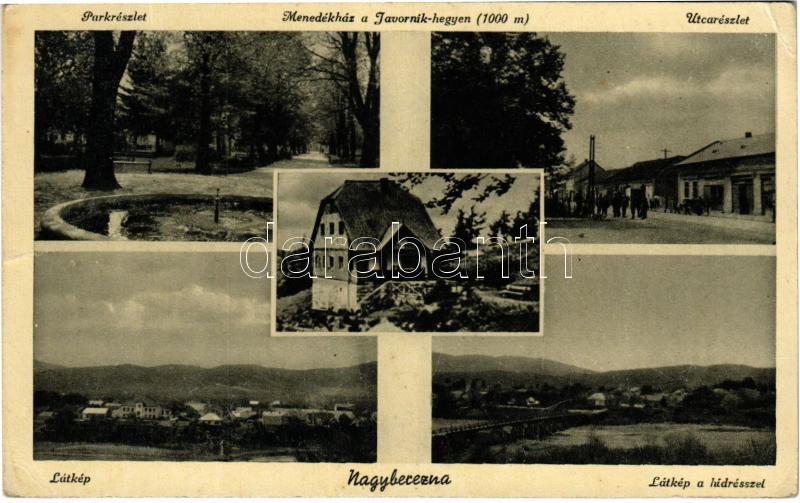 Nagyberezna, Velykyi Bereznyi, Velky Berezny; park, Menedékház a Javorník-hegyen, utca, híd. Mérai Jánosné kiadása / rest house, street, bridge (EK)