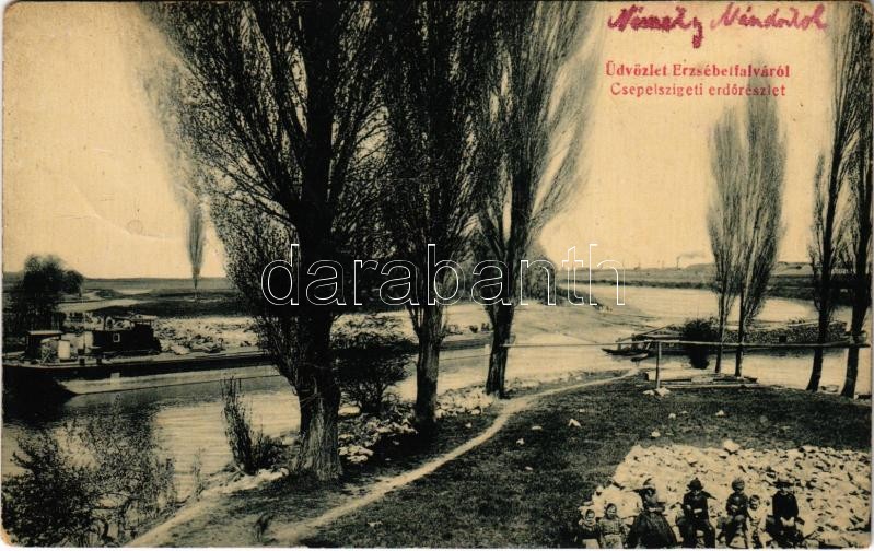 1914 Budapest XX. Pestszenterzsébet, Pesterzsébet, Erzsébetfalva; Csepel szigeti erdő részlet, uszály. Kiadja Zucker Jenő (W.L.?) 4384.
