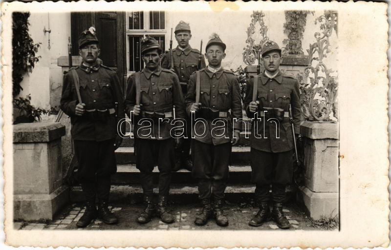 1940 Sepsiszentgyörgy, Sfantu Gheorghe; katonák virágokkal a sisakjukban / military, soldiers with flowers in their hats. Angelo Köntés photo (fl)