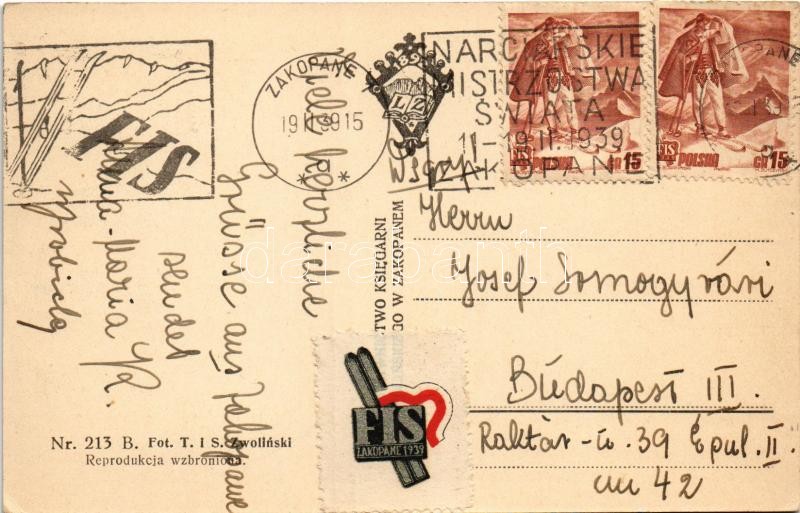 Description: 1939 Zakopane w zimie. Skocznia narciarska pod Krokwia / Winter sport in Zakopane. Ski jump at Krokwia + "Narciarskie Mistrzostwa Swiata 11-19. II. 1939 Zakopane" So. Stpl. (EK)