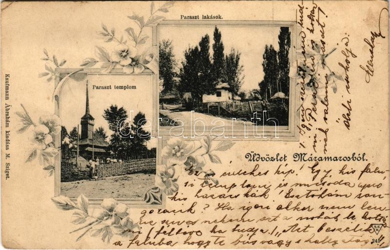 1905 Máramarossziget, Sighetu Marmatiei; Üdvözlet Máramarosból. Paraszt templom, paraszt lakások. Kaufmann Ábrahám kiadása / Greetings from Maramures! Peasant church and peasant houses. Art Nouveau, floral (EK)