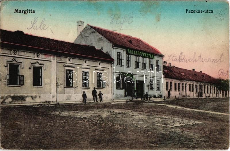 Margitta, Marghita; Fazekas utca, Takarékpénztár, Szennyesi Károly üzl...