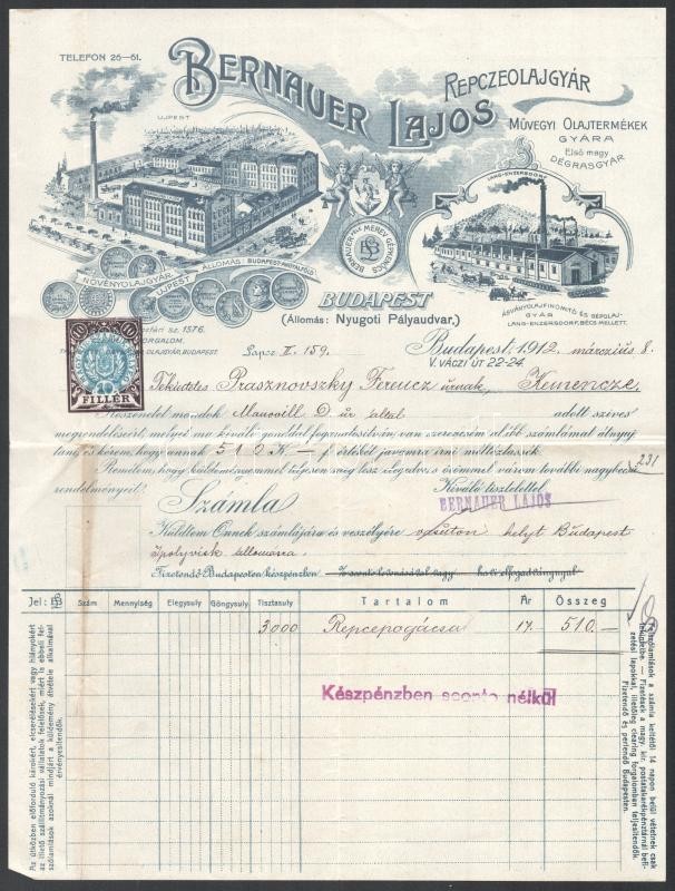 1912 Bp., Bernauer Lajos Repceolajgyár fejléces számlája és levél, val...