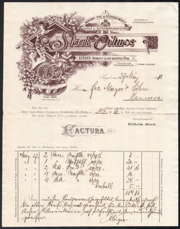 1913 Szeged, Stark Vilmos kőfaragó műhely, sírkő és bútormárványgyár fejléces számla
