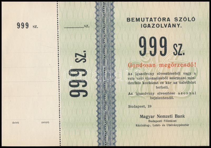 cca 1930 MNB által kibocsátott bemutatóra szóló igazolvány, 999. sz.