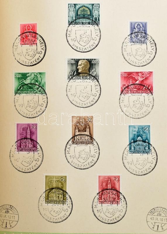 Description: 1940 A Magyar Szent Koronához visszatért keleti és erdélyi területeknek az országgal való egyesítése alkalmával a M. Kir. Posta által használt emlékbélyegzők lenyomatai, halina kötésben, jó állapotban, ritka, 20p
