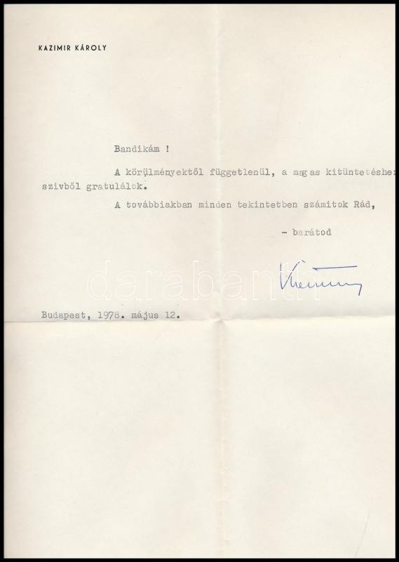 1978 Kazimir Károly (1928-1999) tanár, rendező, mint a Thália Színház igazgatója saját kézzel aláírt gépelt levele Marton Endre rendezőnek kitüntetése alkalmából, hajtva, szép állapotban, eredeti borítékjában