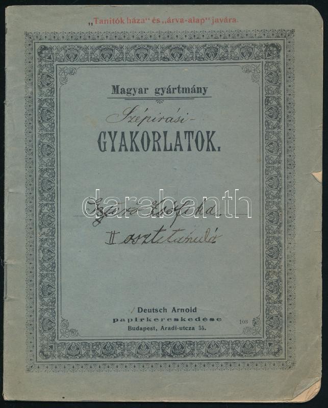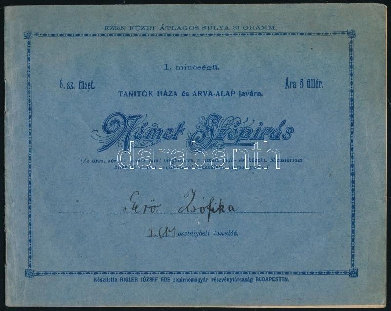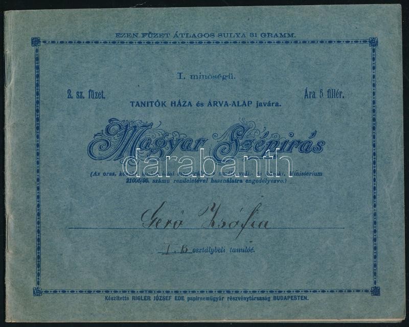 Description: cca 1901-1902 Gerő Zsófia (1895-1966), Gerő Ödön (1863-1939) műkritikus, író lányának 5 db első és második osztályos gyakorló füzete, mind beírt, helyenként kissé foltos és sérült